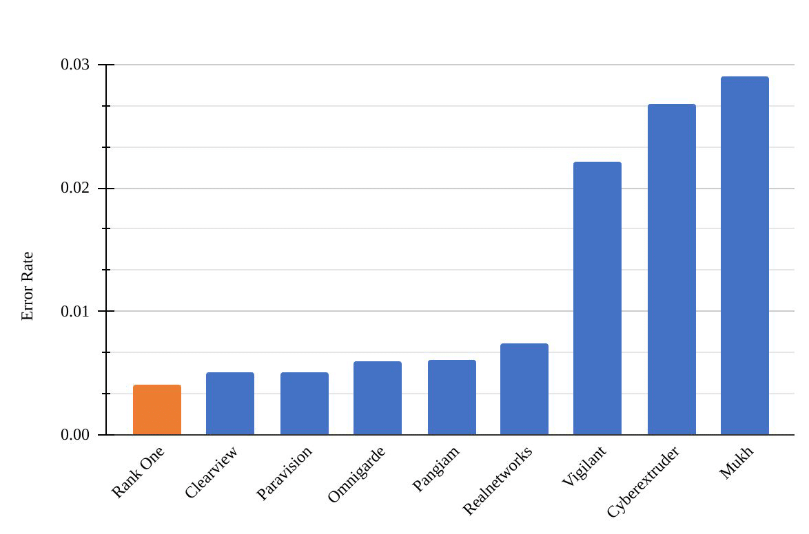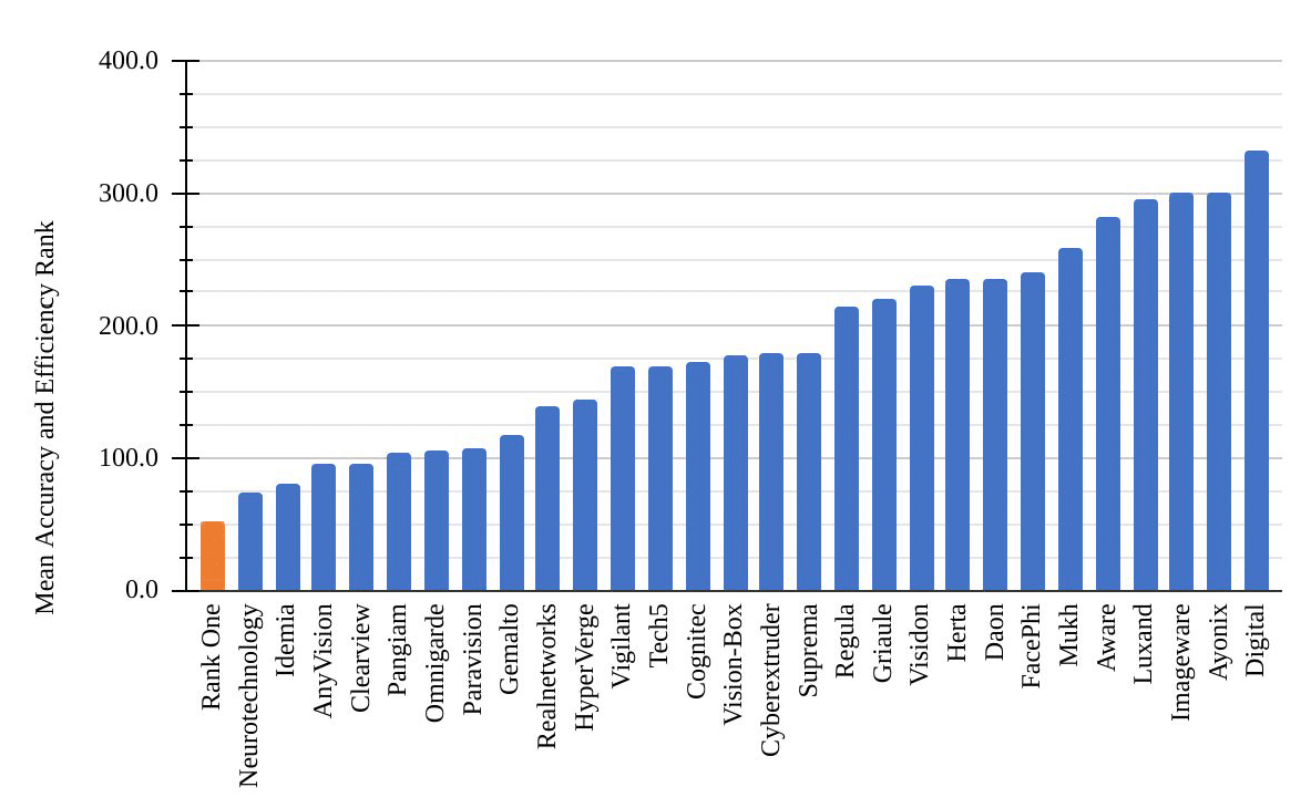 As shown in Figure 1 below from the 07/28/2022 NIST FRVT Ongoing report, Rank One is, by a wide margin, able to deliver the best combination of accuracy and efficiency when measuring the mean FRVT rankings in all eight accuracy benchmarks (Tables 18 to 27: Visa MC, Visa, Mugshot, Mugshot 12+Yrs, VisaBorder, Border 10-6, Border 10-5, Wild) and all four efficiency benchmarks (Tables 8 to 17: template generation speed, template size, binary size, and comparison speed.)